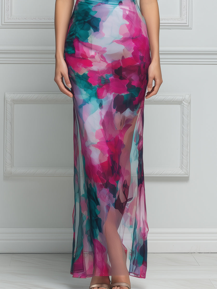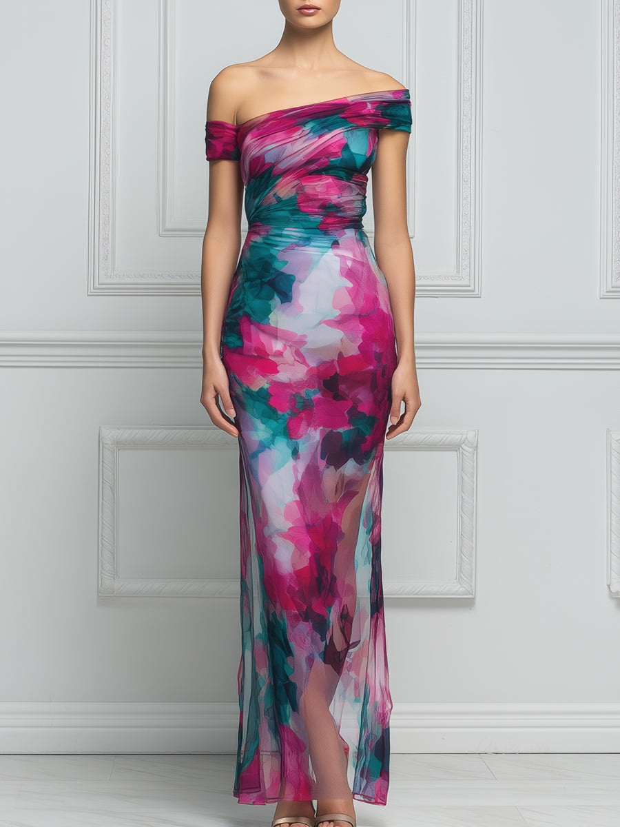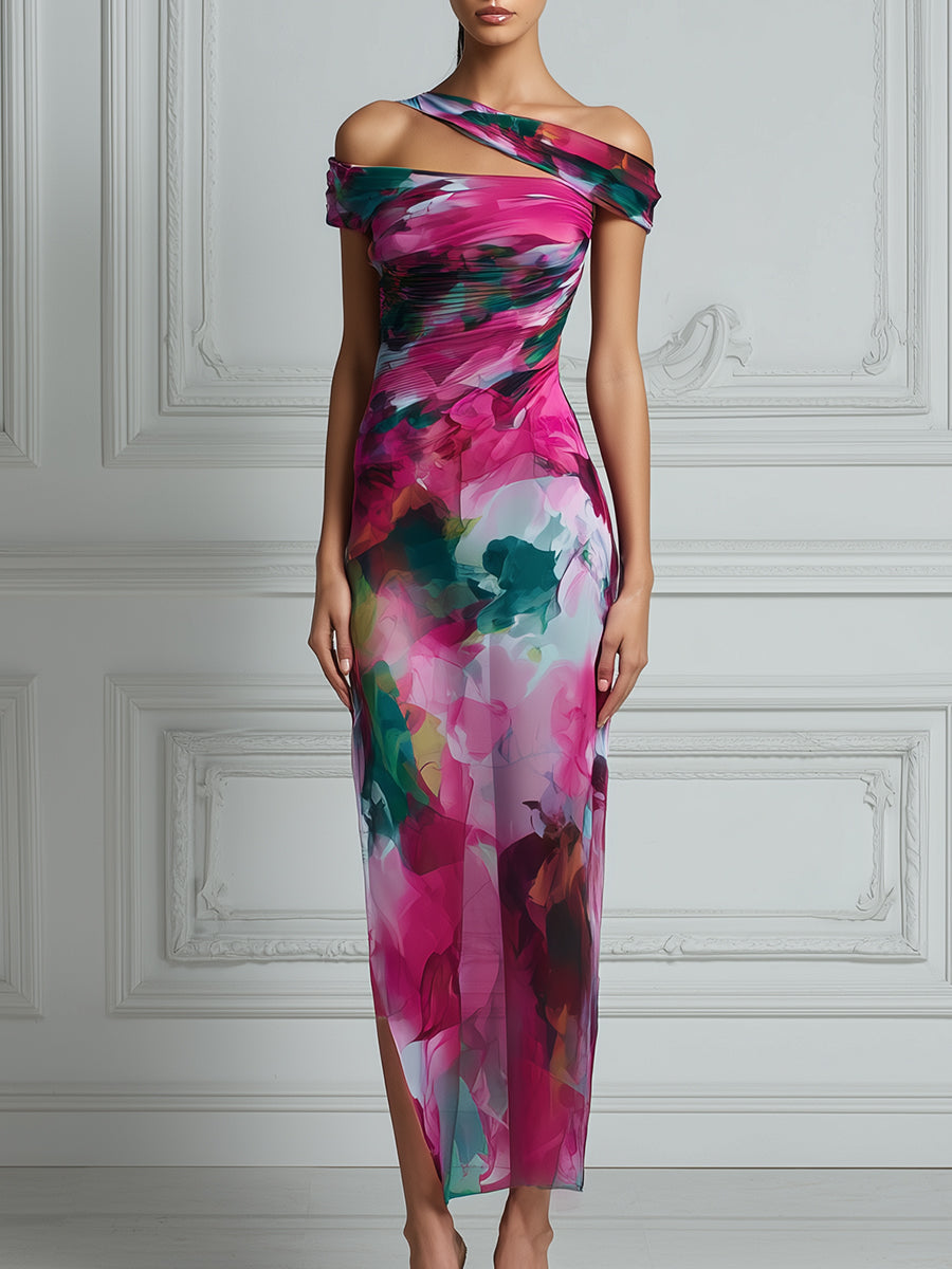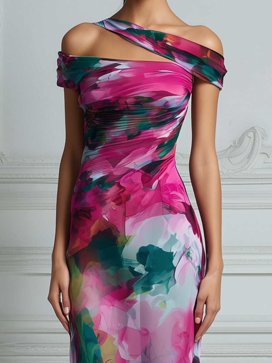 Asymmetric Off-Shoulder Ruched Watercolor Print Bodycon Maxi Dress