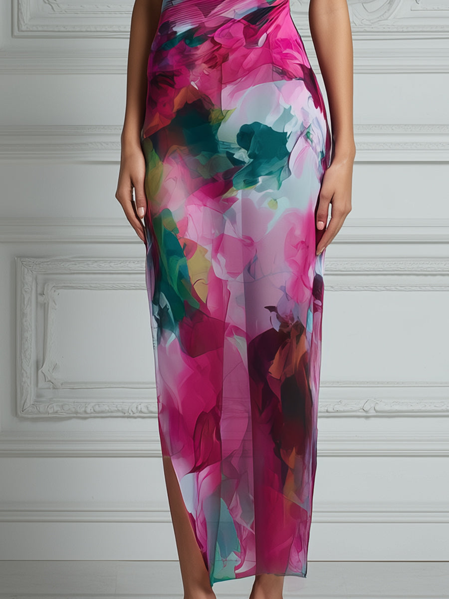 Blooming Watercolor Cap Sleeve Chiffon Dress