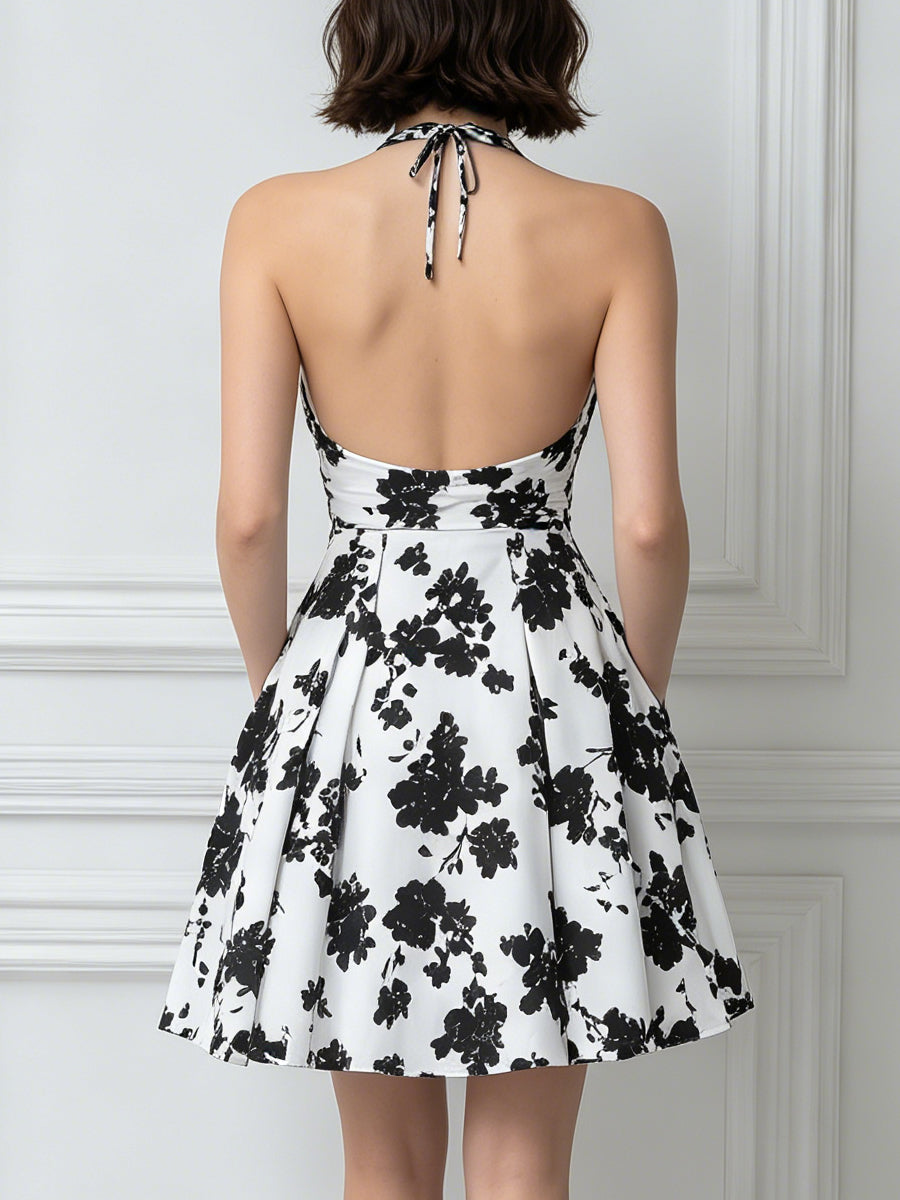 Black & White Floral Print Halter Neck A-Line Mini Dress