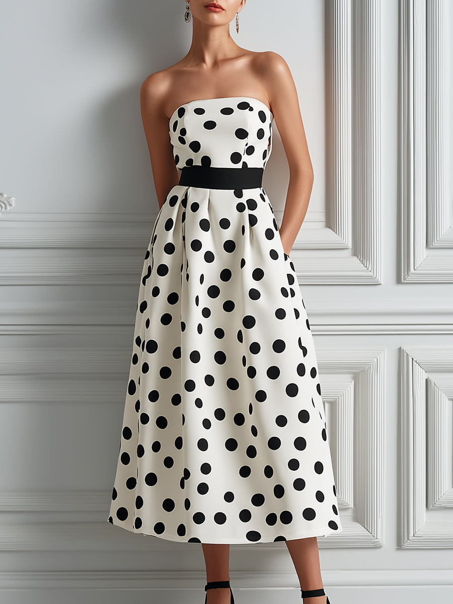 Black & White Polka Dot Strapless A-Line Midi Dress
