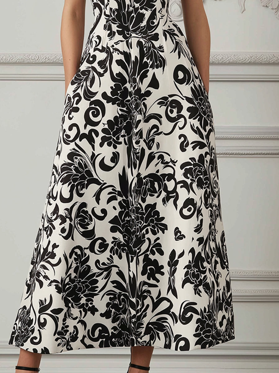 Black & White Baroque Floral Print Square Neck A-Line Midi Dress