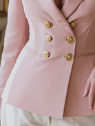 The Blush Pink Double-Breasted Tailored Blazer exudes soft power and modern sophistication. Crafted from a smooth, structured fabric, this blazer flatters the silhouette with its sculpted waist and sharp tailoring. The design features a double-breasted front adorned with gold embossed buttons — a signature touch that adds a hint of timeless luxury.