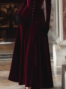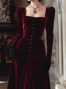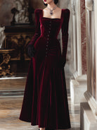 Burgundy Velvet Button-Front Gown With Structured Bodice