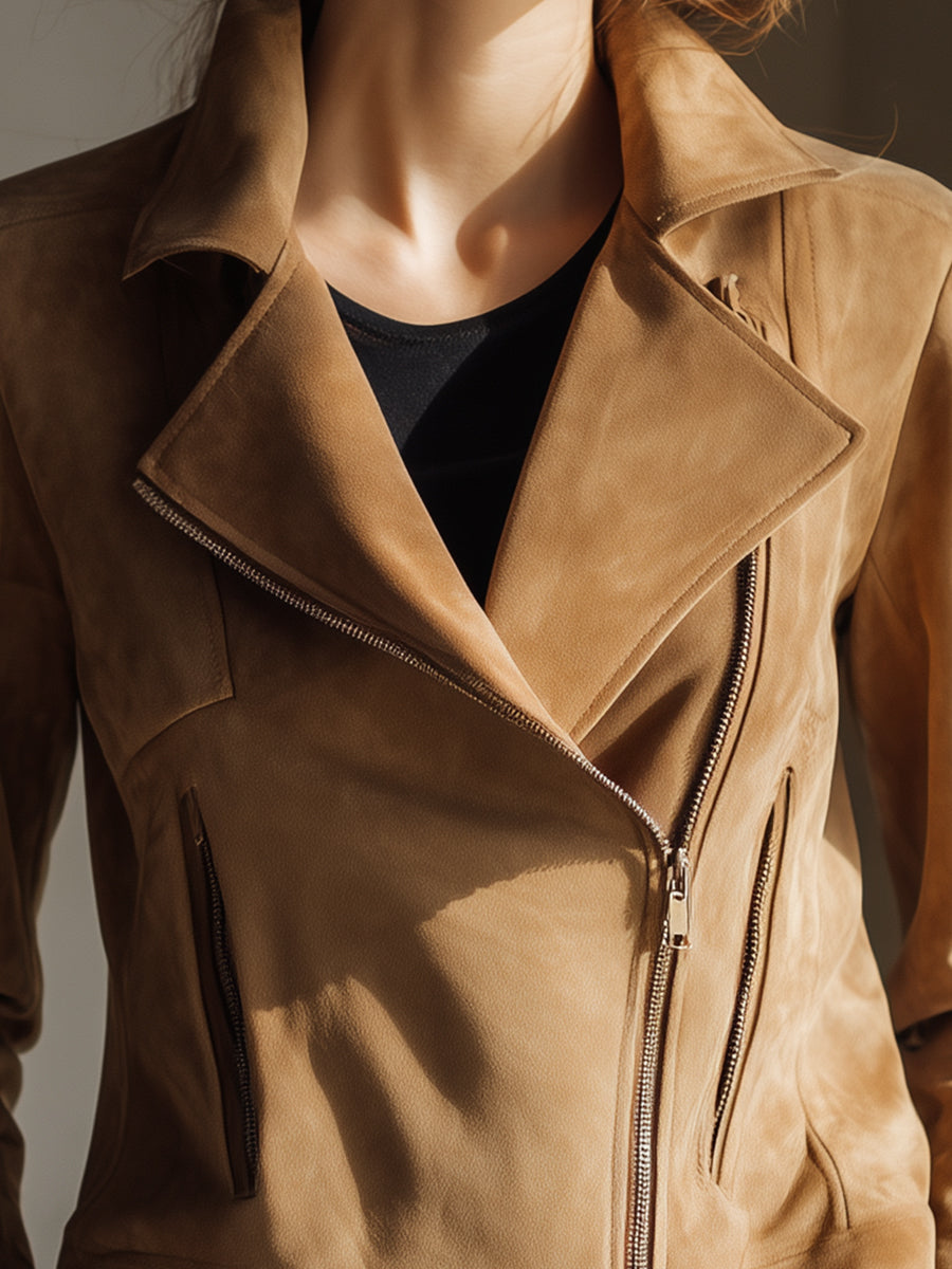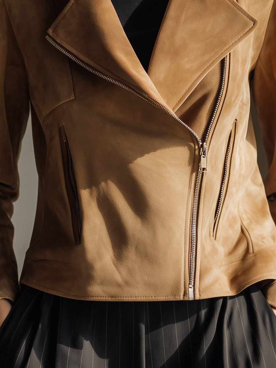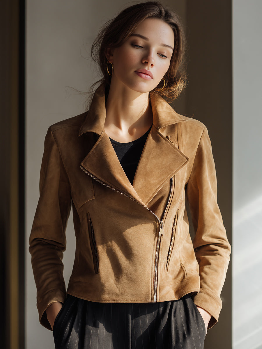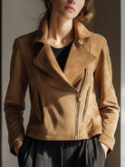 Crovaya introduces the Camel Suede Moto Jacket — a refined interpretation of the classic biker silhouette, crafted for the modern woman who values understated strength and sophistication. Designed from supple suede with a matte finish, it offers a luxurious touch while maintaining a structured, urban edge.