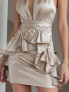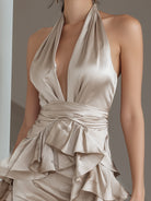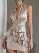 This Champagne Ruffled Halter Satin Mini Dress is designed for women who appreciate bold elegance with an unmistakable sense of modern glamour. Crafted from high-luster satin, the dress features a fluid drape that enhances its sculptural silhouette. The halter neckline creates a striking focal point, framing the shoulders and décolletage with feminine allure. Its deep V-front adds a sensual note while maintaining a balanced, sophisticated presence.
