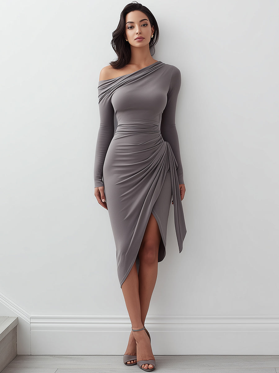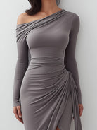 Introducing the Chic Asymmetric Draped Gray Bodycon Dress, a figure-enhancing piece that combines modern aesthetics with classic charm. This dress is the epitome of refined elegance, featuring a unique asymmetrical design that highlights your silhouette beautifully. The dress boasts a one-shoulder style that adds a touch of sensuality, while the draping across the waist enhances the dress’s structure and creates a flattering shape.