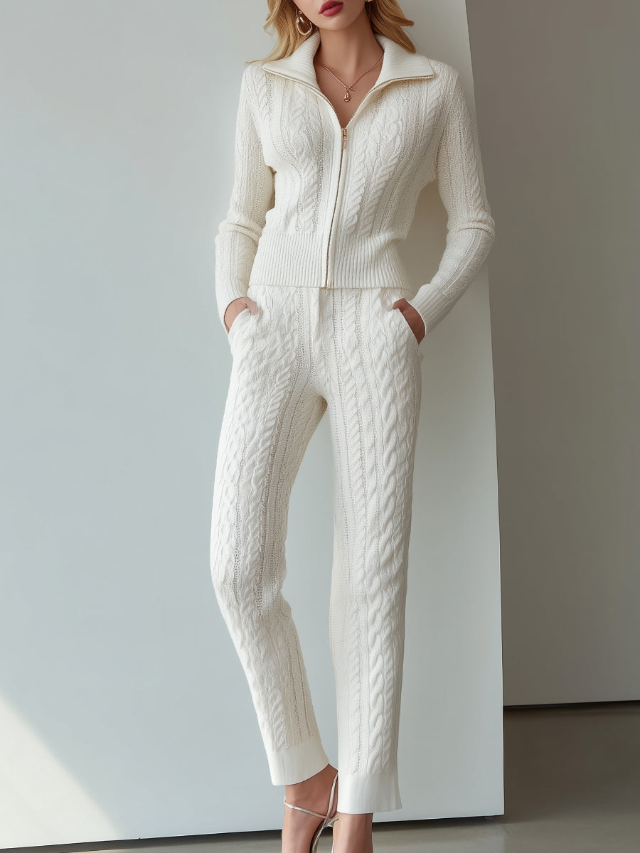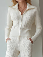 Chic Cable Knit Full Zip Sweater And Tapered Pants Set In Ivory