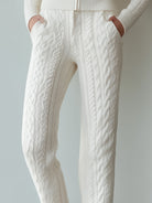 A perfect balance of comfort and luxury, this cable-knit sweater and tapered pants set in classic ivory is the epitome of cozy-chic. Featuring a full-zip front and a ribbed collar, the sweater boasts a relaxed, slightly oversized fit, perfect for layering or wearing on its own for a laid-back yet polished look. The tapered pants are designed to cinch at the ankle, offering a modern silhouette that’s both stylish and flattering.