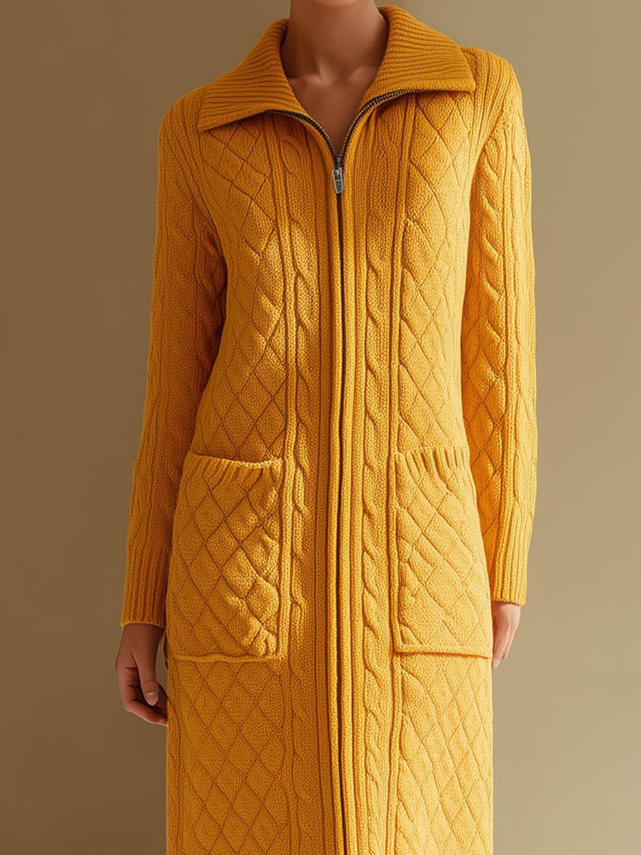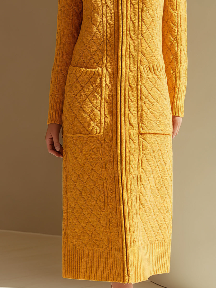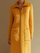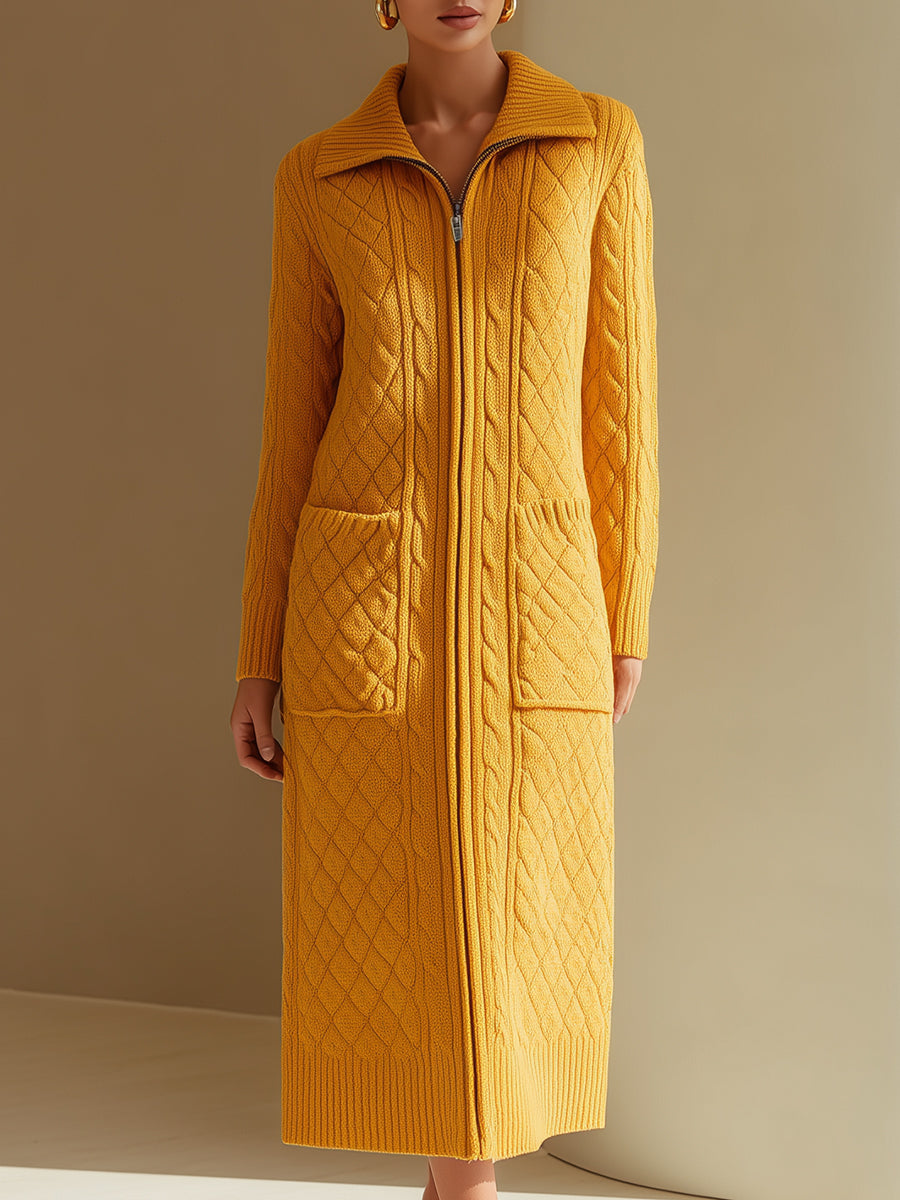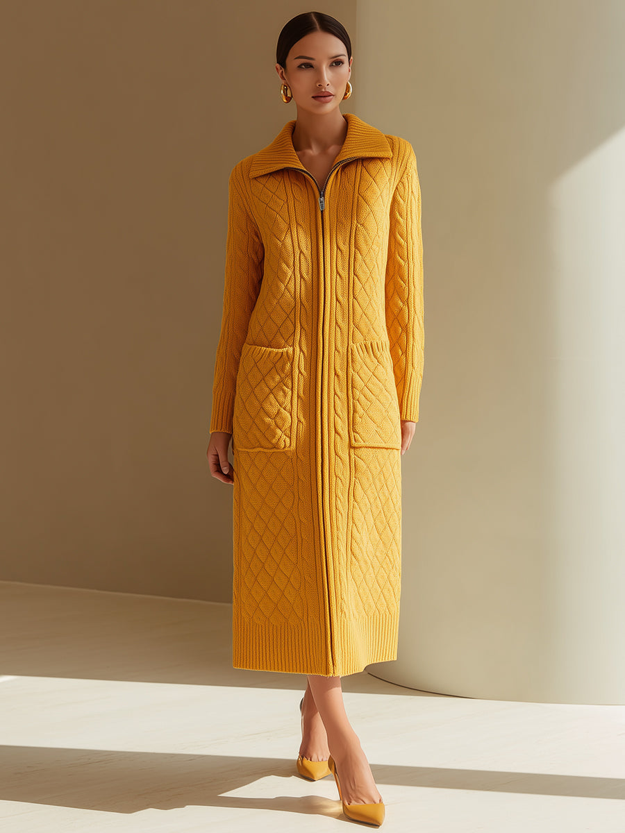 Make a bold statement with the Colorful Yellow Cable Knit Midi Cardigan Dress, an ideal fusion of comfort, warmth, and eye-catching design. Crafted from a soft and durable yarn, this vibrant yellow piece combines the best of cozy knitwear and contemporary fashion. Its long length and tailored fit provide an elegant silhouette, while the front zipper and two large pockets add functional flair.