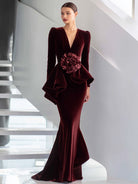Crovaya presents the Bordeaux Bloom Velvet Peplum Gown, a dramatic fusion of sculptural design and romantic detail. Crafted in plush burgundy velvet, the gown features structured shoulders and a plunging V-neckline that flows into a peplum waist, highlighted by a voluminous 3D floral appliqué.