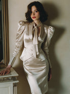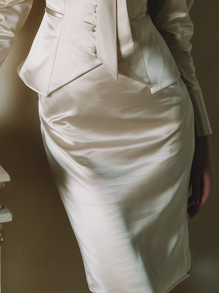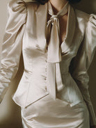 Crovaya presents the Champagne Satin Bow-Tie Blazer Skirt Set, a luxurious expression of femininity and power. Designed in lustrous champagne satin, this two-piece ensemble is crafted for women who embrace timeless glamour with a modern edge. The blazer features structured shoulders, a cinched waist, and a dramatic bow-tie neckline that frames the décolletage with sophistication. Satin-covered buttons run down the bodice, accentuating its tailored silhouette while emphasizing elegance and refinement.