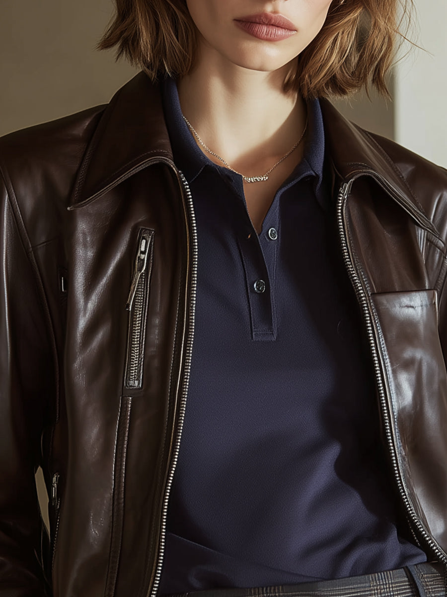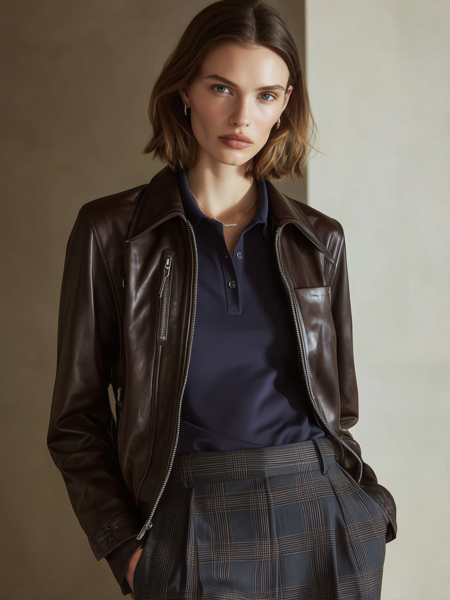 Crovaya introduces a refined interpretation of the classic leather jacket—an essential outerwear piece designed for the modern woman who values structure, sophistication, and quiet confidence. This dark-coffee jacket is crafted with a smooth, polished finish that instantly elevates everyday styling. From tailored workwear to weekend denim, its versatility is one of its strongest attributes.