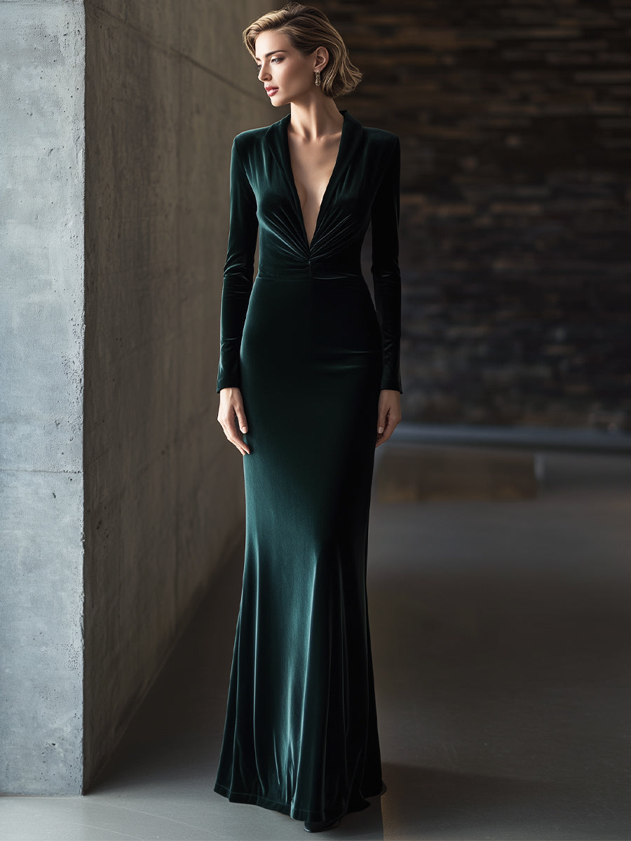 The Emerald Poise Velvet Gown from Crovaya epitomizes understated luxury. Crafted from rich emerald green velvet, this gown features a plunging V neckline and long sleeves for an elongating, elegant silhouette.