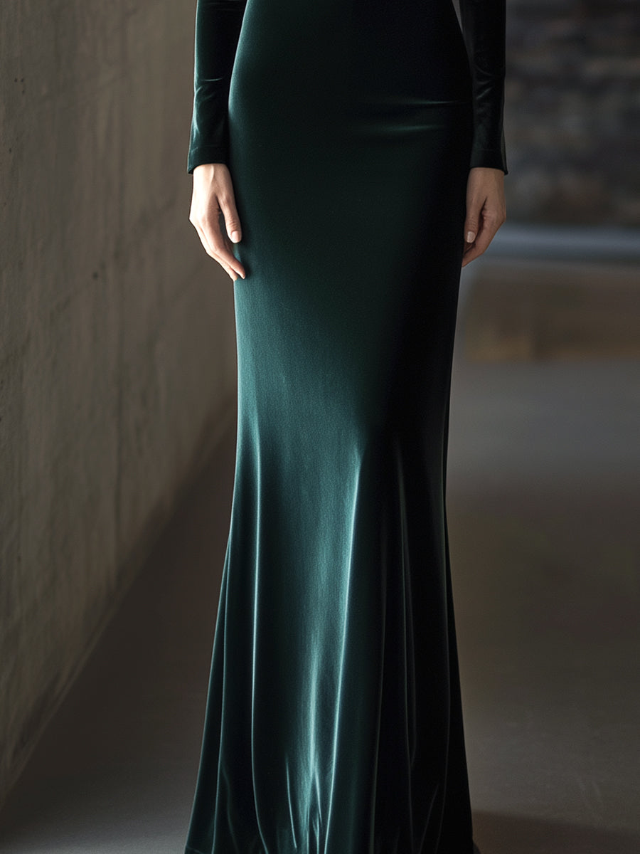 Its smooth, body-skimming cut creates a refined presence, while the floor-length hemline exudes formal glamour. Ideal for winter evenings, formal dinners, or seasonal galas, this gown is both versatile and commanding. Elevate the look with diamond accents and metallic heels for a radiant finish.