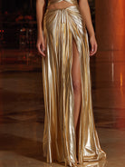 Crovaya presents the Golden Radiance Cut-Out Halter Gown, an audacious evening statement crafted for modern glamour. Shimmering in liquid gold fabric, the gown reflects light with every movement, exuding both drama and opulence. Its halter neckline features daring cut-out detailing across the waist, emphasizing sculptural lines and highlighting the feminine form.