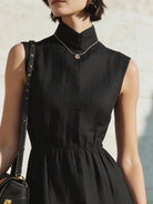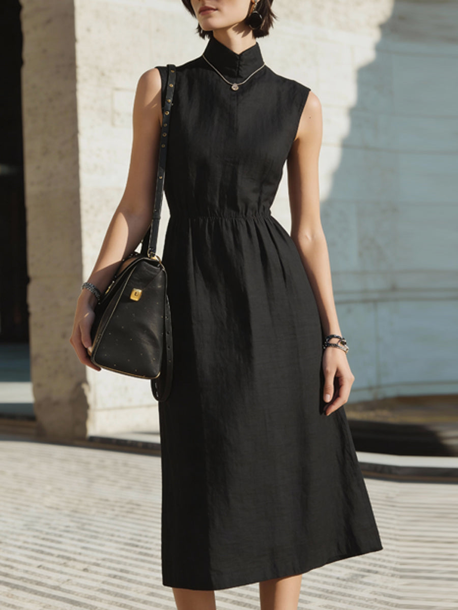 Crovaya introduces the High-Neck Sleeveless Midi Dress — a masterclass in modern minimalism and refined tailoring. This design redefines understated elegance through its clean lines, sculpted silhouette, and architectural neckline. The high-neck collar brings a poised, contemporary edge, beautifully framing the shoulders and elongating the upper body. Crafted from a smooth, breathable woven fabric, the dress strikes the ideal balance between structure and fluidity, allowing it to move gracefully with every step.