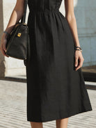Thoughtful waist gathering enhances the natural shape without overwhelming the silhouette, creating an effortlessly flattering fit suitable for a wide range of body types. The sleeveless cut adds a sense of lightness, making this piece a versatile staple for transitional dressing across seasons. Falling to a polished midi length, the skirt maintains a sleek vertical flow that complements both casual sophistication and elevated evening styling.