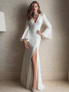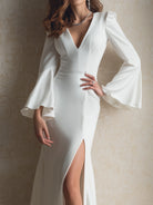 Crovaya presents the Ivory Grace Gown, where sophistication meets modern elegance. Tailored in luxurious ivory satin, this gown features a plunging V-neckline balanced by dramatic long sleeves with flared cuffs.