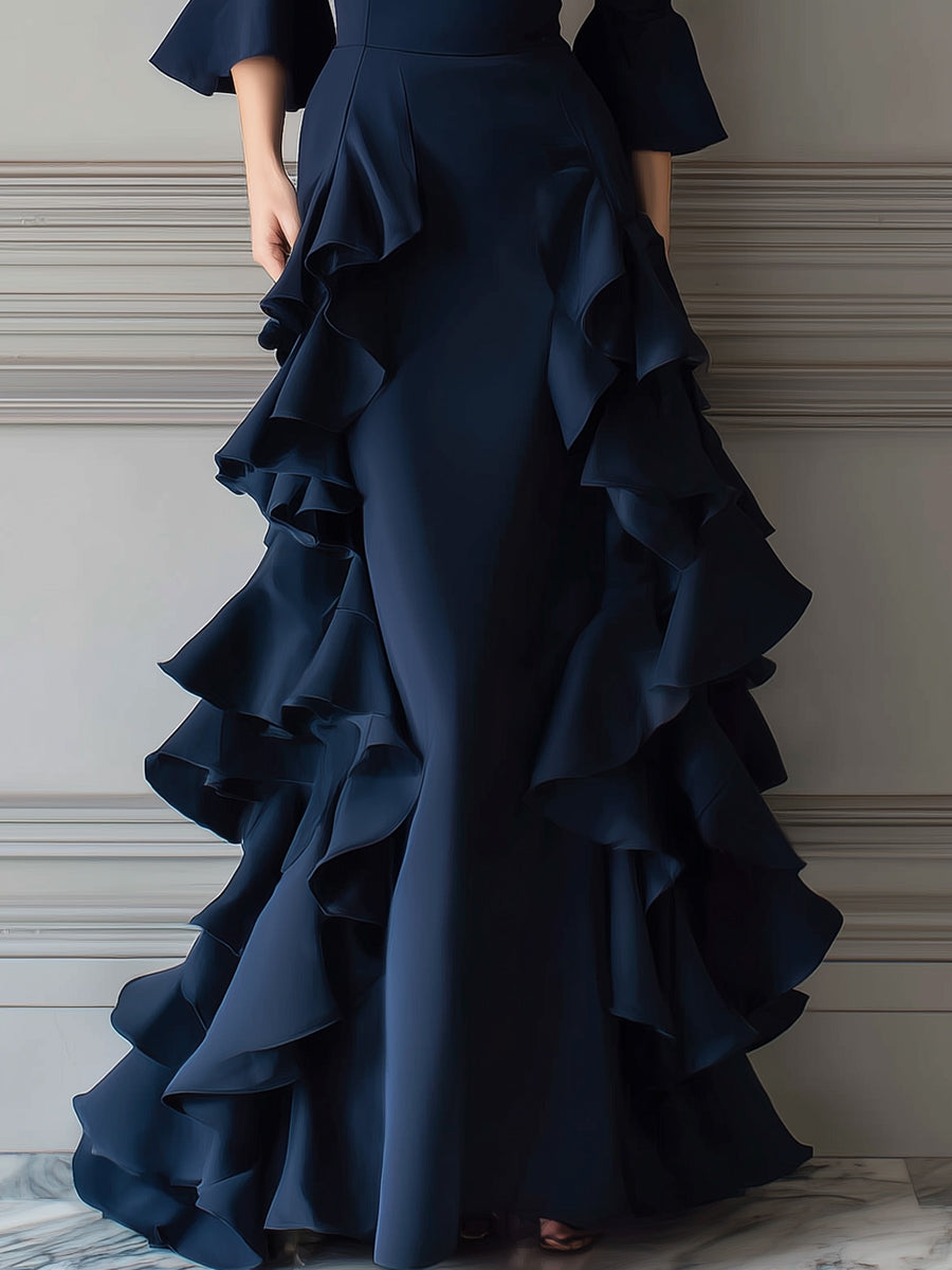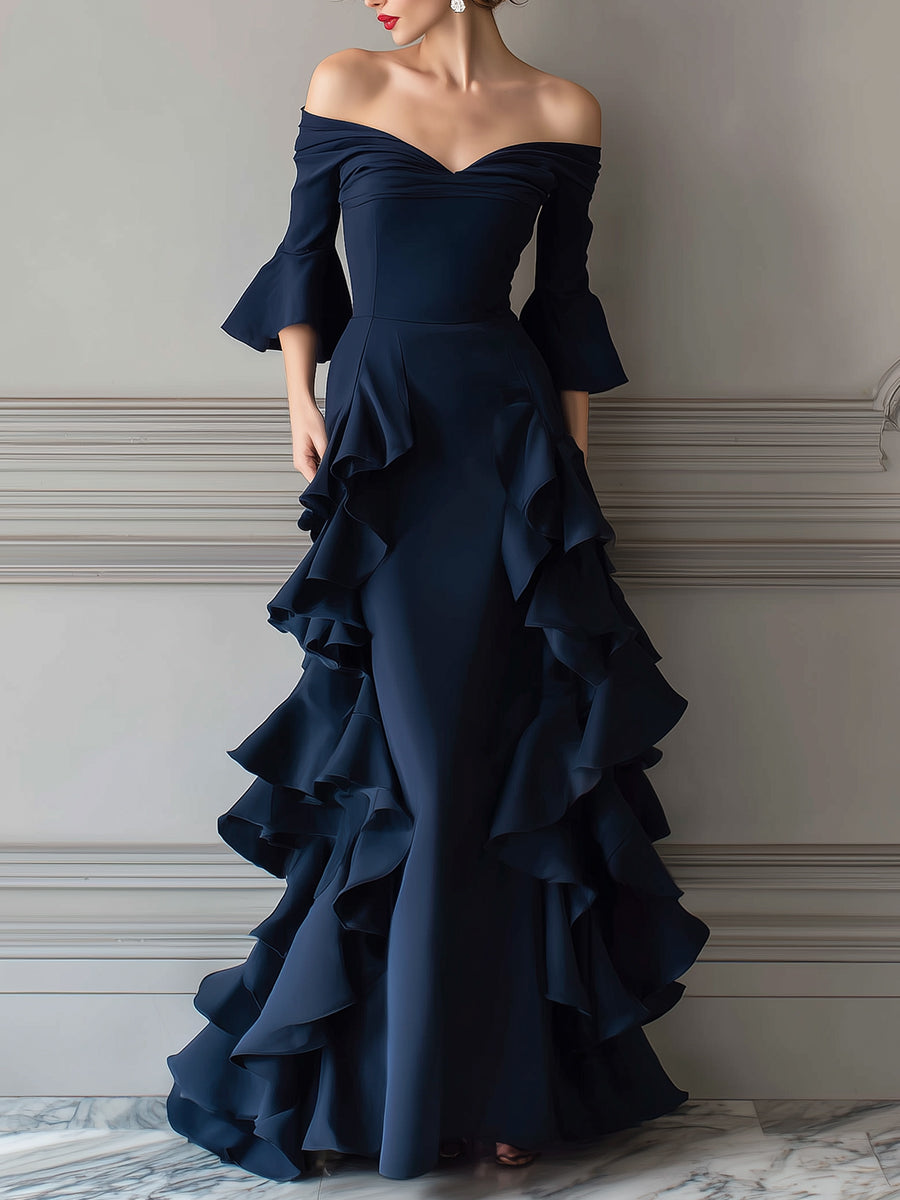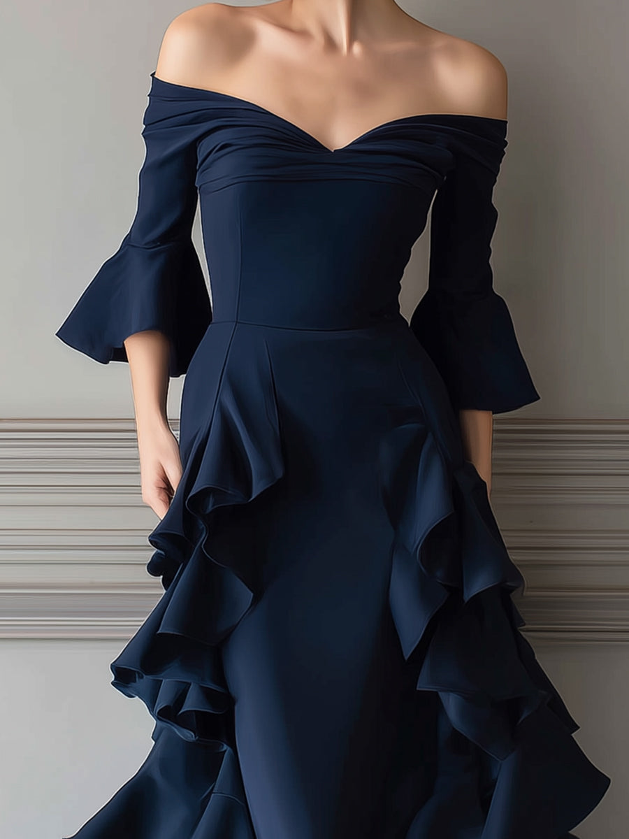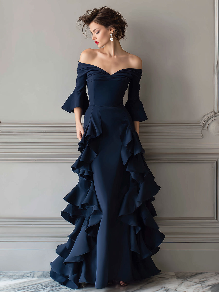 Crovaya presents the Midnight Ruffle Elegance Gown, an enchanting statement piece crafted for women who exude sophistication and individuality. This off-the-shoulder navy gown embraces a romantic yet dramatic aesthetic with its structured bodice and cascading ruffle tiers. Designed with three-quarter bell sleeves and a fitted silhouette, the gown elongates the figure while allowing fluid movement.