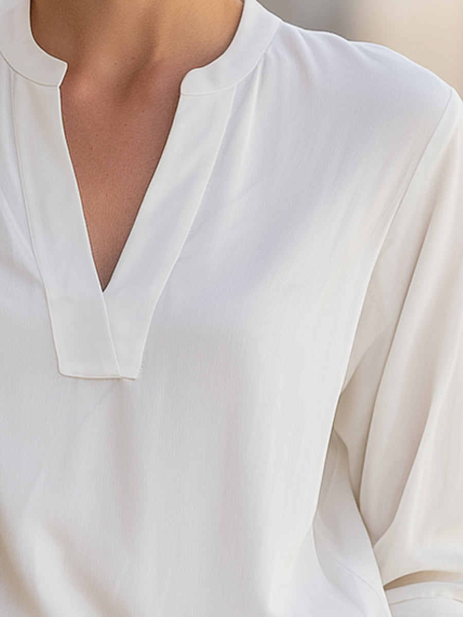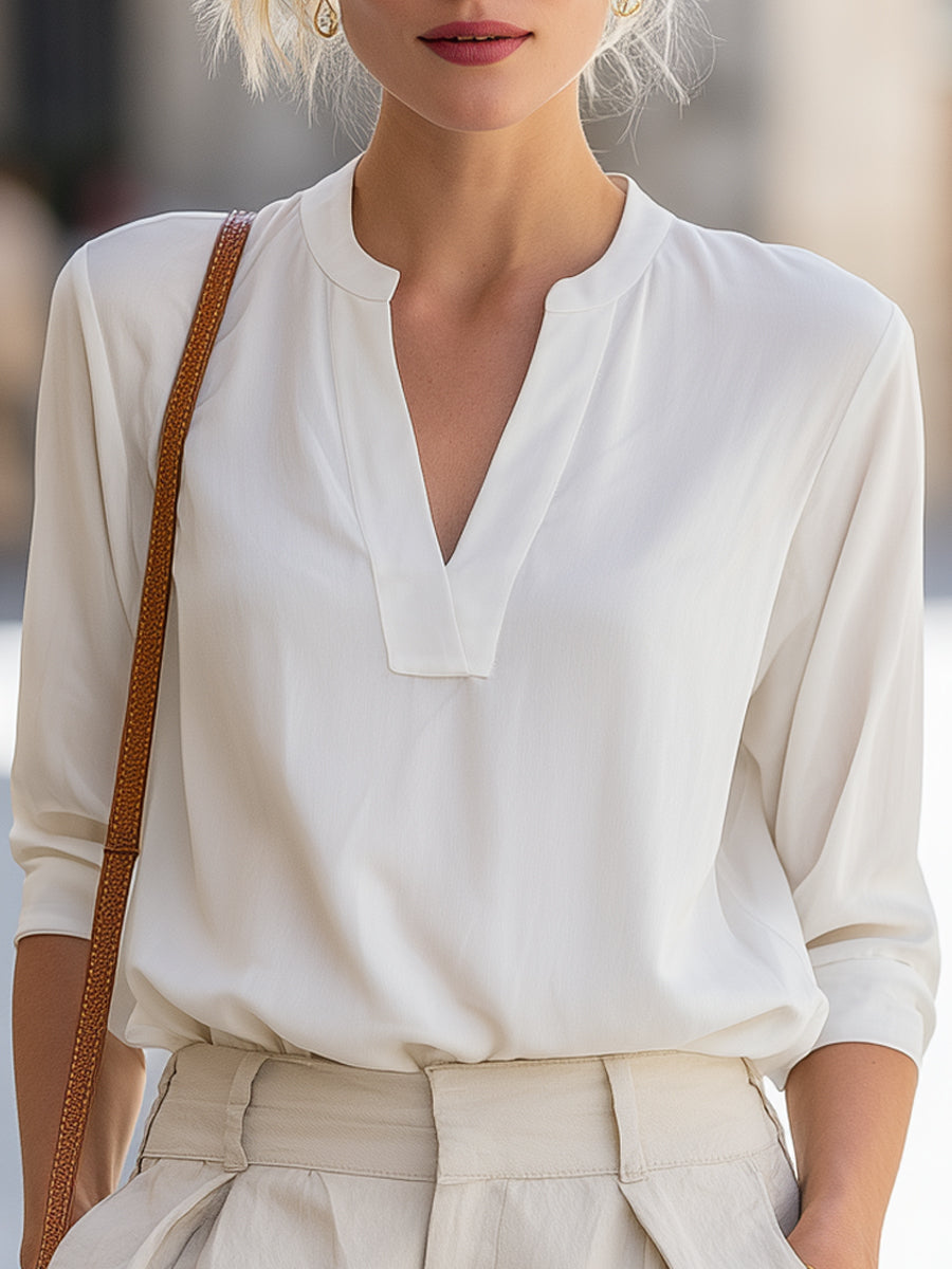 - Design: Minimalist V-slit neckline blouse with softly structured shoulders