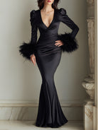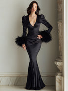 Crovaya introduces the Noir Feathered Glamour Gown, a celebration of drama and elegance. Designed in a body-hugging silhouette, this gown showcases a plunging V-neckline with wrap-style bodice and figure-defining ruching. Long fitted sleeves are finished with dramatic feathered cuffs, adding texture and theatrical flair.