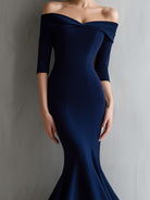 Crovaya introduces an evening gown that embodies timeless elegance with a contemporary edge. This navy mermaid gown is defined by its sculpted silhouette, seamlessly combining classic tailoring with modern glamour. Designed with an off-shoulder neckline, the dress frames the collarbone and shoulders with graceful femininity, while the three-quarter sleeves lend a touch of sophistication suitable for cooler evenings.