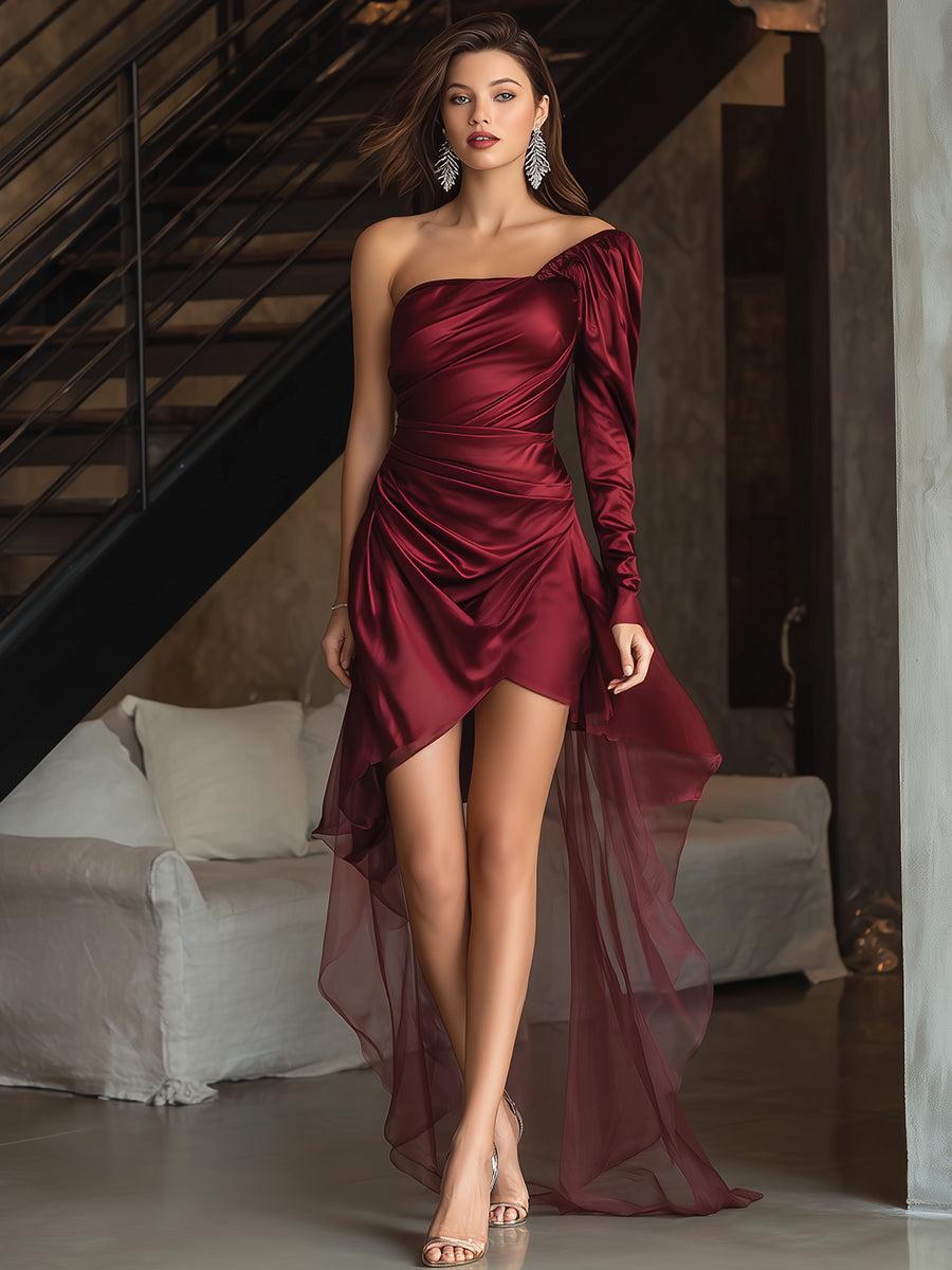 The gown’s defining feature is its bold one-shoulder neckline, sculpted to frame the collarbone with effortless elegance. A single long fitted sleeve creates balance and intrigue, contrasting beautifully with the exposed shoulder. The bodice is meticulously ruched to flatter the waistline, offering structure while enhancing natural curves. Crafted in rich burgundy satin, the fabric glides over the body with a luminous sheen, catching the light in every movement.