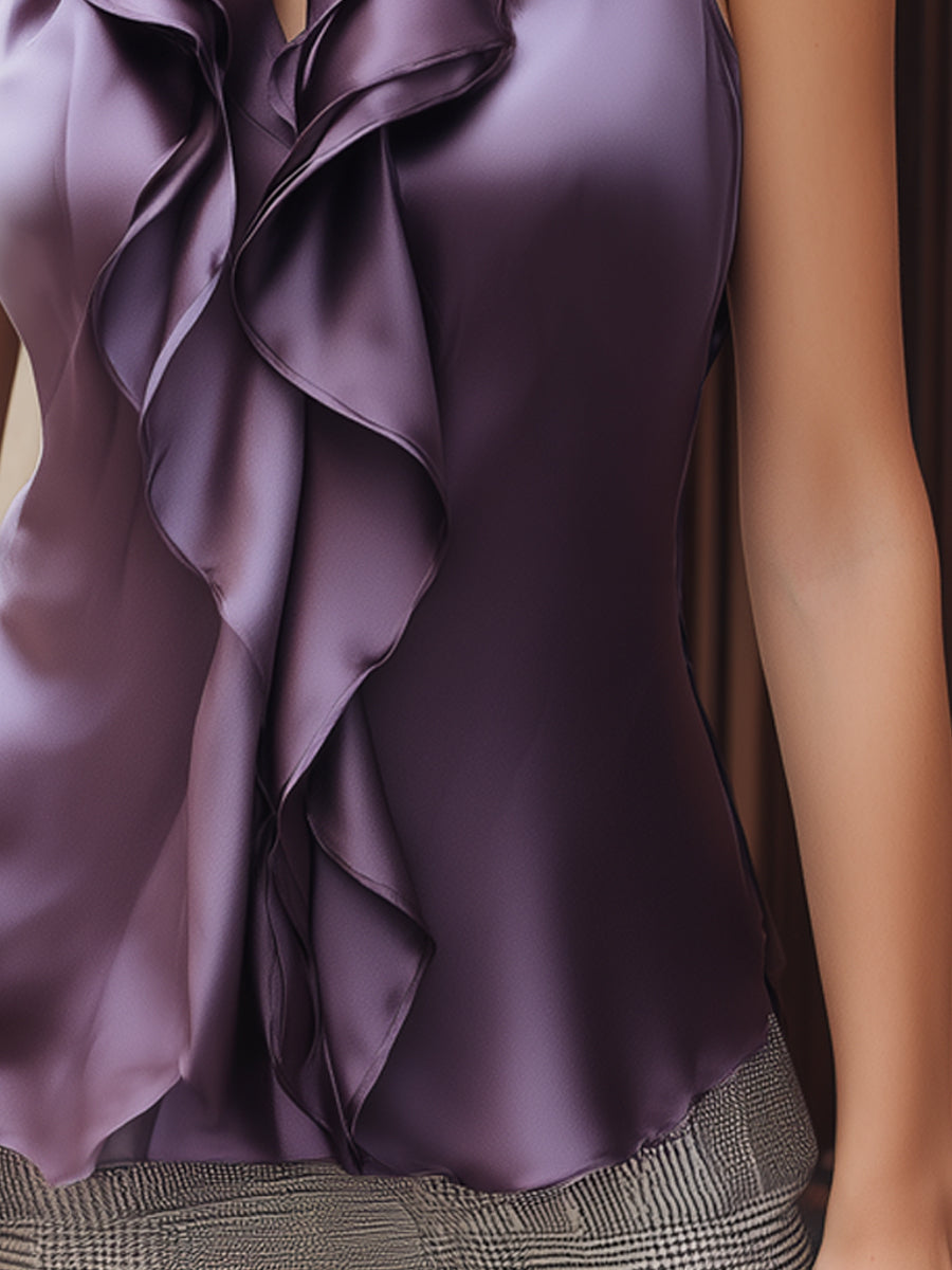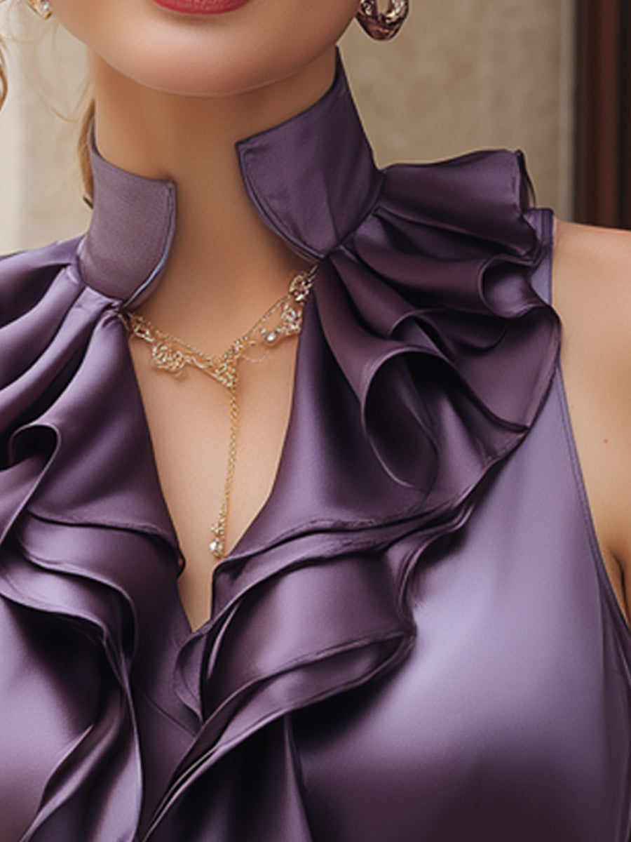 Crovaya Satin Plum High-Neck Ruffled Sleeveless Blouse