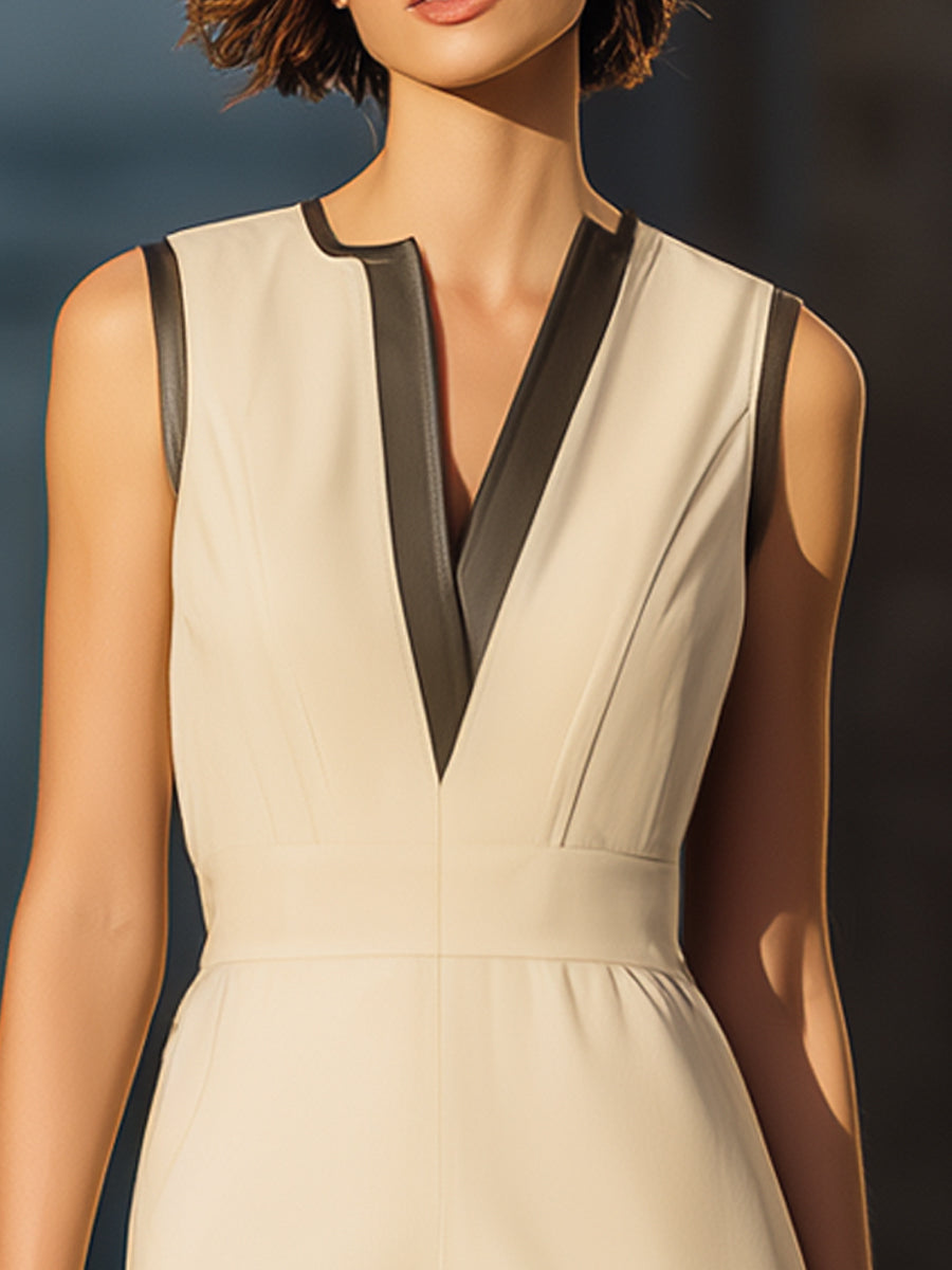 - Design: Sleeveless midi dress with contrasting-edge V-neckline and matching trim pocket detail