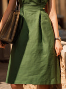 The A-line skirt flows with gentle structure, offering ease of movement and an elegant drape that feels at home both in motion and at rest. Side pleats add dimension and elevate the silhouette with quiet craftsmanship. The sleeveless cut enhances the dress’s modern minimalism, making it a versatile style that transitions seamlessly from daytime outings to refined evening gatherings.