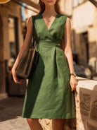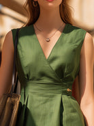 Crovaya presents a refined sleeveless midi dress that captures the effortless sophistication of warm-weather dressing through clean tailoring, crisp structure, and understated femininity. This thoughtfully designed piece features a sharp yet graceful V-neckline that elongates the silhouette while maintaining a polished, city-chic presence. The bodice is skillfully shaped with subtle pleating and a softly fitted waist, creating a naturally contoured look that flatters a wide range of figures without sacrificing comfort.