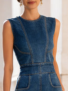 Crafted from premium mid-weight denim, the fabric offers a smooth yet structured drape that maintains shape while providing all-day comfort. Carefully placed panel seams contour the bodice, subtly enhancing the natural lines of the figure. The clean, sleeveless design brings a sense of modern minimalism, while the high round neckline introduces a touch of understated elegance suitable for both relaxed and elevated moments.