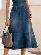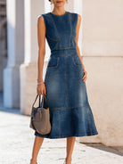 - Design: Sleeveless denim midi dress with contour paneling and patch pockets