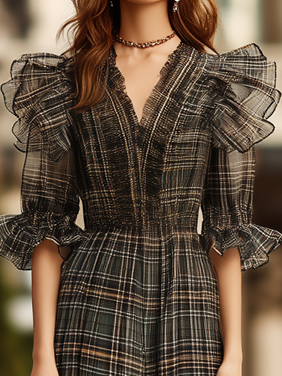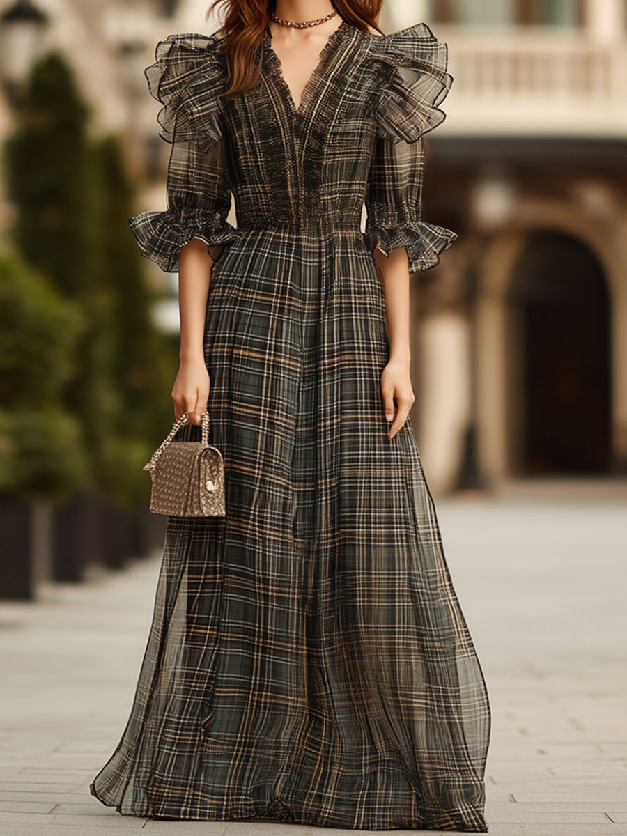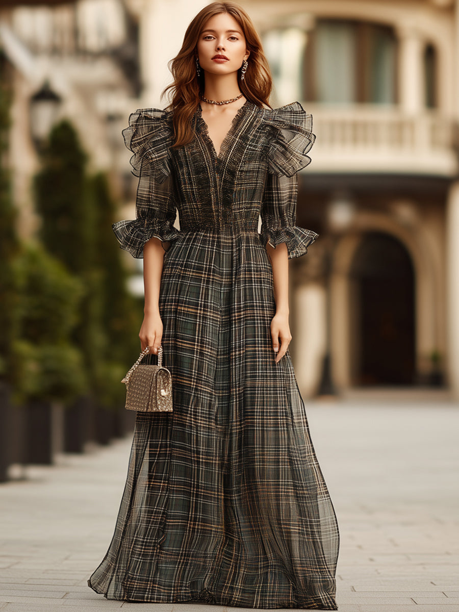 Crovaya Vintage Plaid Chiffon Maxi Dress With Layered Ruffle Sleeves