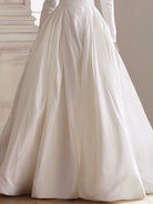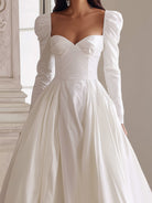 Crovaya presents an ethereal masterpiece designed for the modern romantic. This white long-sleeve gown embodies timeless elegance with a structured bodice and a gracefully defined sweetheart neckline, subtly enhancing feminine charm. The fitted upper body transitions seamlessly into a voluminous A-line skirt, creating a statuesque silhouette that commands presence while maintaining graceful fluidity.