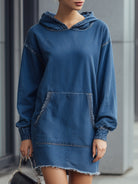 Crovaya presents the Denim Frayed Hem Hoodie Dress, where streetwear comfort meets contemporary elegance. Crafted from soft, denim-textured fabric, this piece combines the relaxed ease of a sweatshirt with the timeless appeal of denim. The oversized hood, kangaroo pocket, and gently dropped shoulders evoke a sense of urban nonchalance, while the frayed hem adds a refined yet casual edge that captures Crovaya’s modern aesthetic.