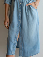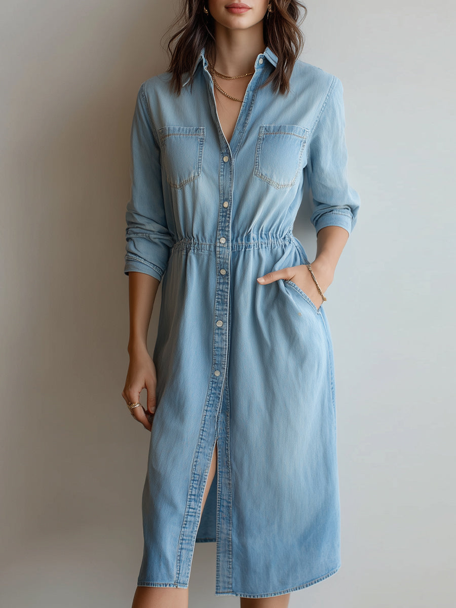 The Denim Shirt Dress with Elastic Waist is the ultimate combination of laid-back style and effortless sophistication. Designed in a light wash denim, this dress features a button-down front, chest pockets, and a flattering elastic waist that cinches for a feminine silhouette. The relaxed fit and mid-length hem create a modern, versatile look that can be worn casually or dressed up with accessories.
