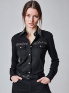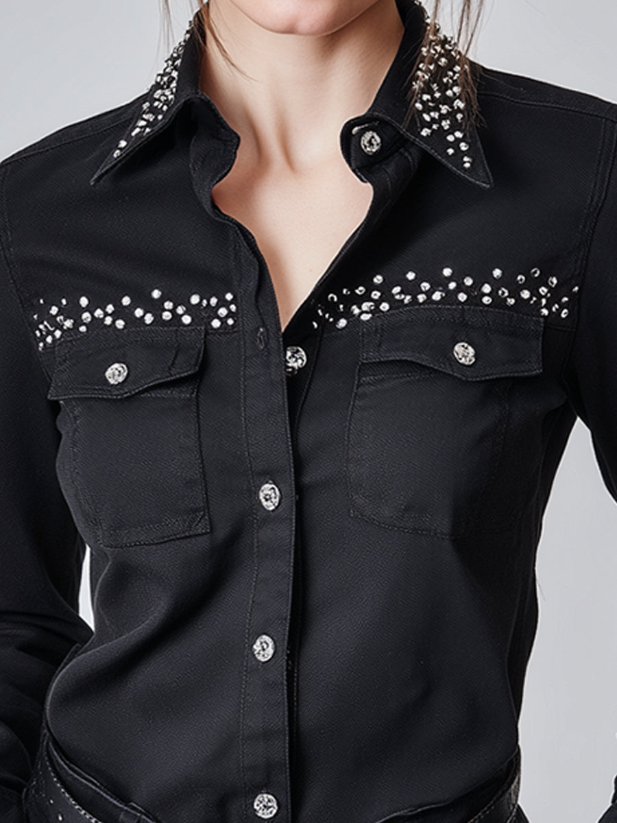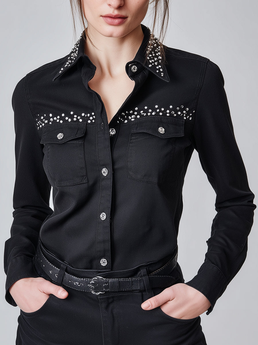 Elegant Black Denim Shirt With Rhinestone Embellishments