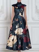 Elevate your wardrobe with this striking A-line midi dress, designed to merge refined structure with bold artistic expression. The mandarin collar neckline creates a sleek and elevated upper silhouette, offering a modern, polished look with subtle Eastern-inspired elegance. Cap sleeves provide a clean and balanced frame, enhancing the shoulders while maintaining a sophisticated profile. The fitted bodice is expertly tailored to contour the waist, creating a flattering and sculpted shape that transitions seamlessly into a voluminous A-line skirt. This structured silhouette delivers graceful movement while maintaining its architectural form, ensuring a poised and confident presence.