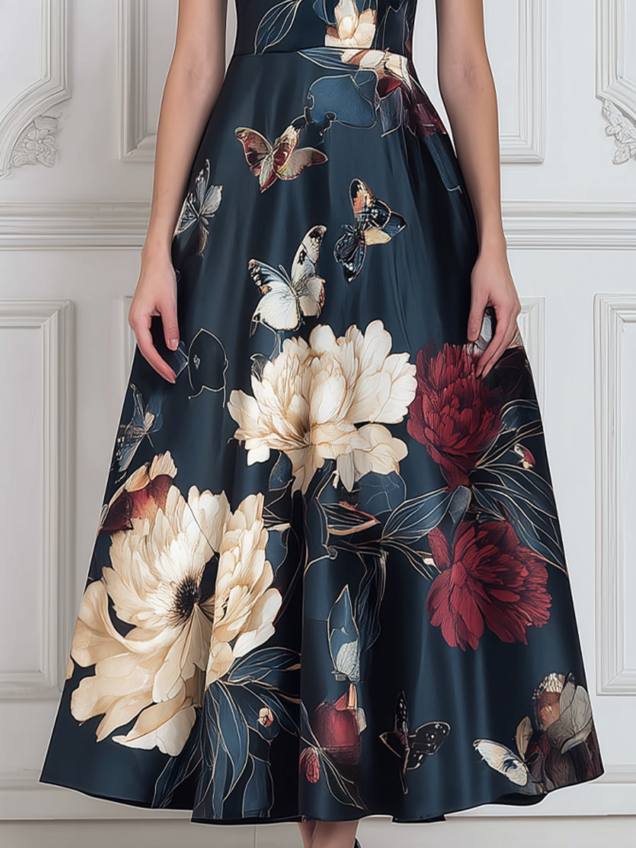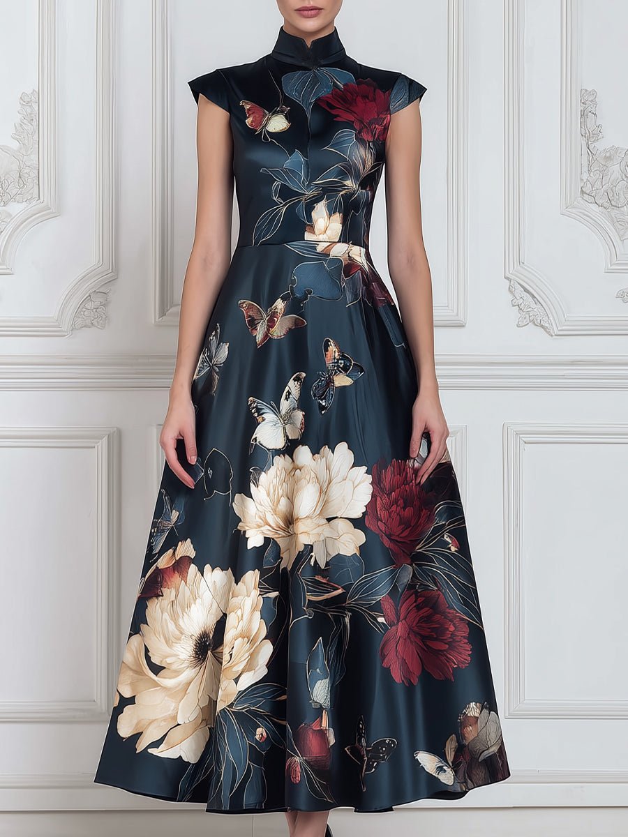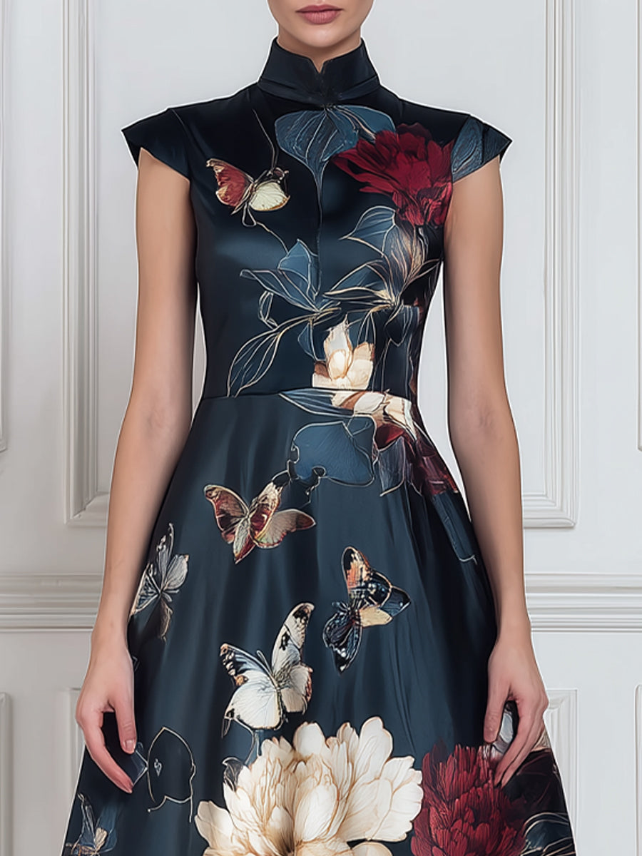Floral Butterfly Print Mandarin Collar Structured A-Line Midi Dress