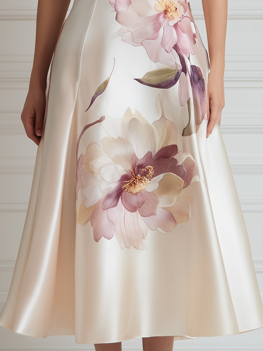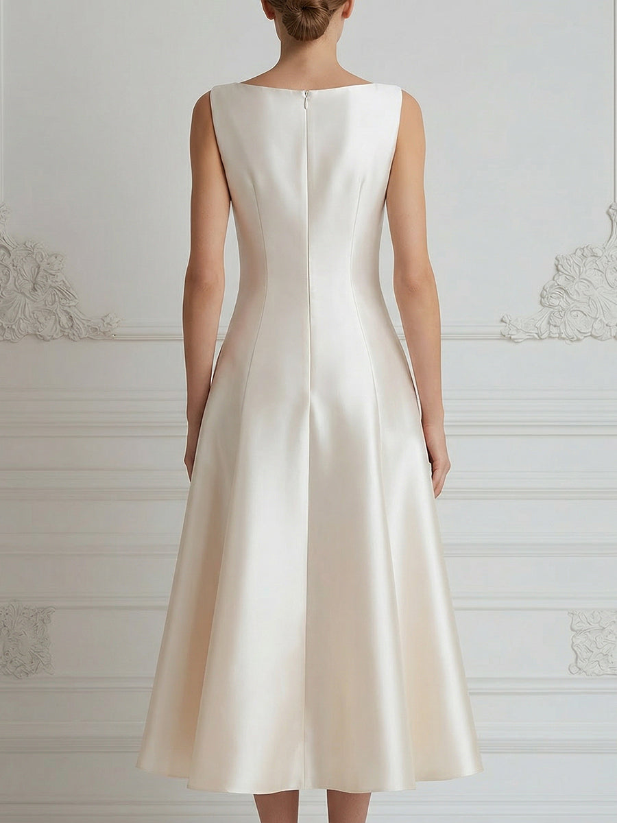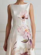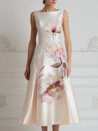 Elevate your wardrobe with this refined A-line midi dress, designed to express timeless elegance through clean tailoring and soft floral artistry. The boat neckline creates a graceful and balanced upper silhouette, subtly framing the collarbone while maintaining a polished and sophisticated appearance. The sleeveless cut enhances the shoulders, offering a sleek and modern profile. The bodice is carefully structured to contour the body, creating a flattering and streamlined fit that transitions seamlessly into a softly flared A-line skirt. This silhouette adds movement and ease, ensuring both comfort and elegance with every step. The smooth, flowing lines enhance the natural shape while maintaining a refined, minimalist aesthetic.