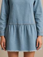 The Gathered Waist Denim Mini Dress redefines feminine ease with a touch of modern minimalism. Crafted from soft light-wash denim, it features a fitted upper bodice and a subtly gathered waistline that transitions into a flared mini skirt. The raw-edged hem adds a casual, playful note while maintaining a structured silhouette.