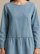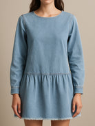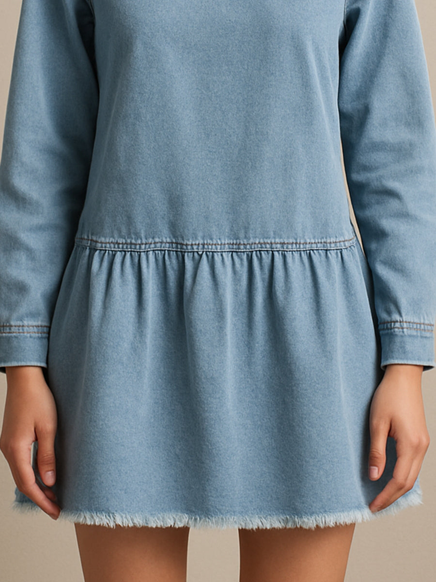 This design blends comfort and refinement — the long sleeves and round neckline offer modest balance to the youthful cut. Whether styled with sneakers for daytime charm or boots for evening edge, it embodies Crovaya’ commitment to everyday sophistication. Every element, from the clean seams to the tactile softness of the denim, reflects the brand’s devotion to timeless craftsmanship and thoughtful design.