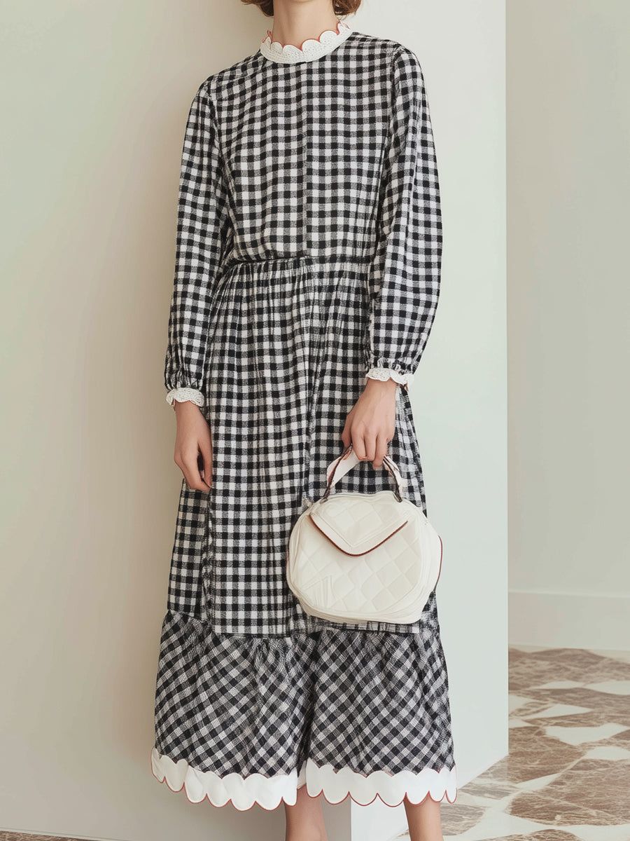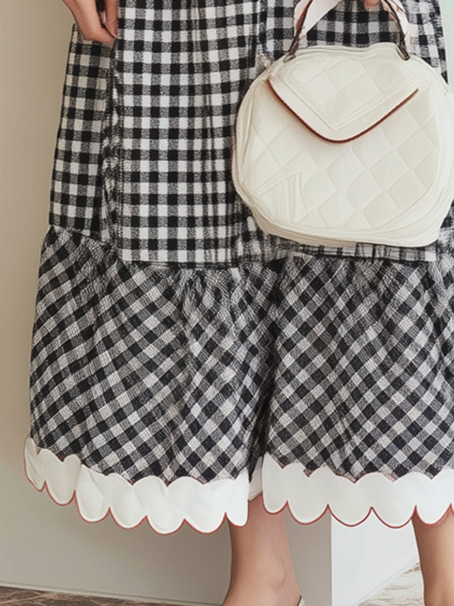 Gingham Puff-Sleeve Midi Dress With Scalloped Hem