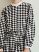 This piece is adorned with a subtle gingham check pattern, offering a fresh, timeless feel that can be styled in numerous ways. A self-tie belt at the waist enhances the dress’s silhouette, giving it a structured yet feminine appearance. Whether paired with sandals for an effortless daytime look or styled with heels for a more polished finish, this dress is perfect for creating chic, elevated outfits for any season.