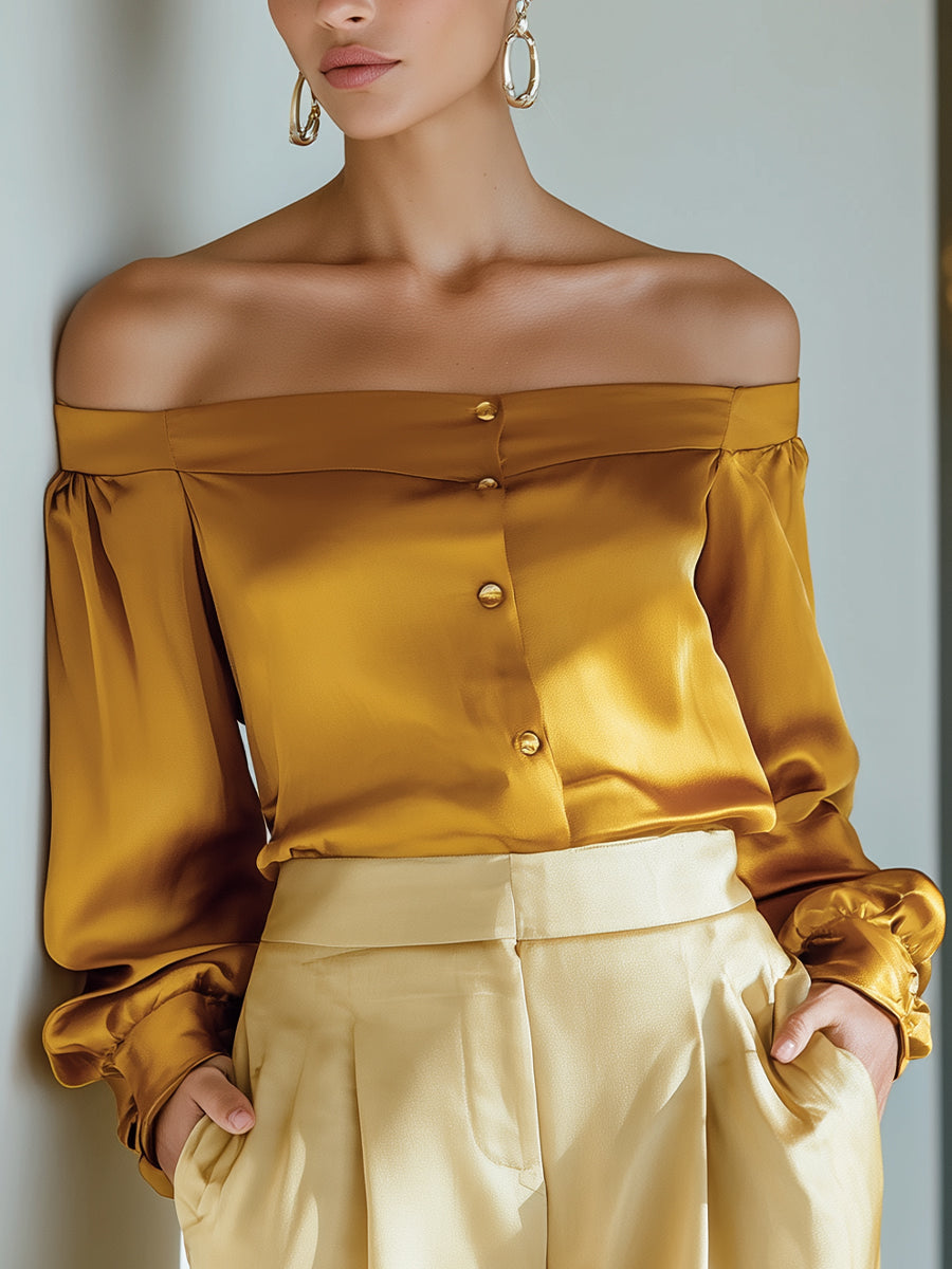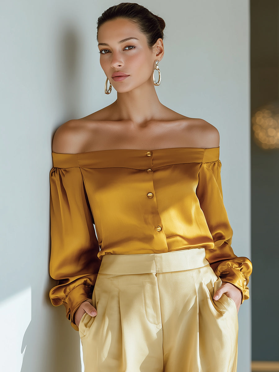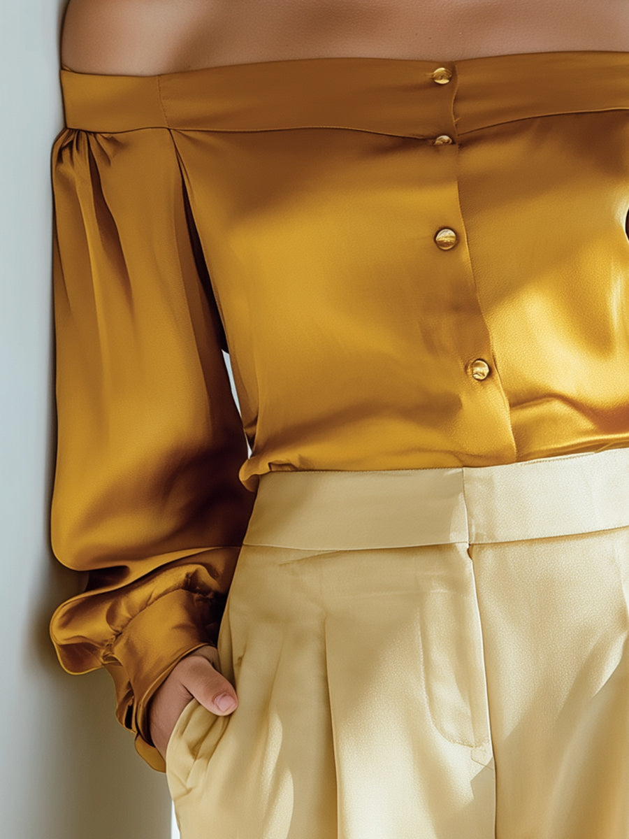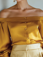 Golden Mustard Off-Shoulder Satin Button Blous