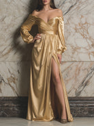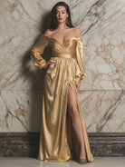 Crovaya introduces a golden evening gown designed to dazzle with radiant sophistication. The gown features an off-shoulder neckline with softly draped satin that accentuates the collarbones, paired with voluminous long sleeves that balance drama with elegance. A fitted waistline defines the silhouette, while the floor-length skirt cascades into a luxurious drape highlighted by a daring front slit, creating a graceful interplay between movement and allure.