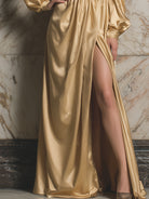 The gown’s golden satin catches the light beautifully, making it ideal for autumn and winter evening occasions where a warm, opulent glow is desired. Designed for women who appreciate bold yet timeless styling, this gown ensures confidence at formal events and soirées. Perfect when paired with statement earrings and classic heels.