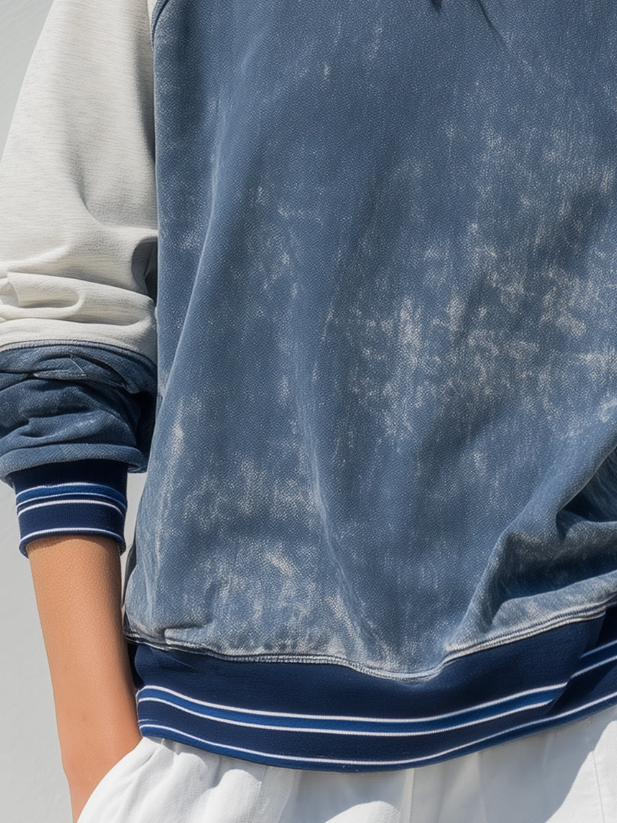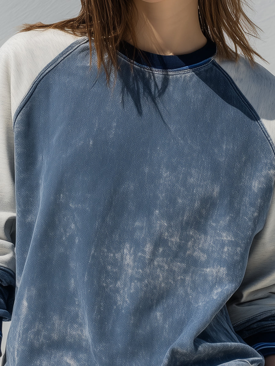 Effortlessly cool and refined, the Indigo Contrast Raglan Sweatshirt blends relaxed street style with polished minimalism. Crafted from soft, washed cotton-blend fabric, it features a two-tone design in denim-inspired blue and off-white sleeves for a casual yet elevated look. The subtle vintage wash effect gives the piece a lived-in charm, while striped ribbed trims at the cuffs and hem enhance its athletic-inspired silhouette.