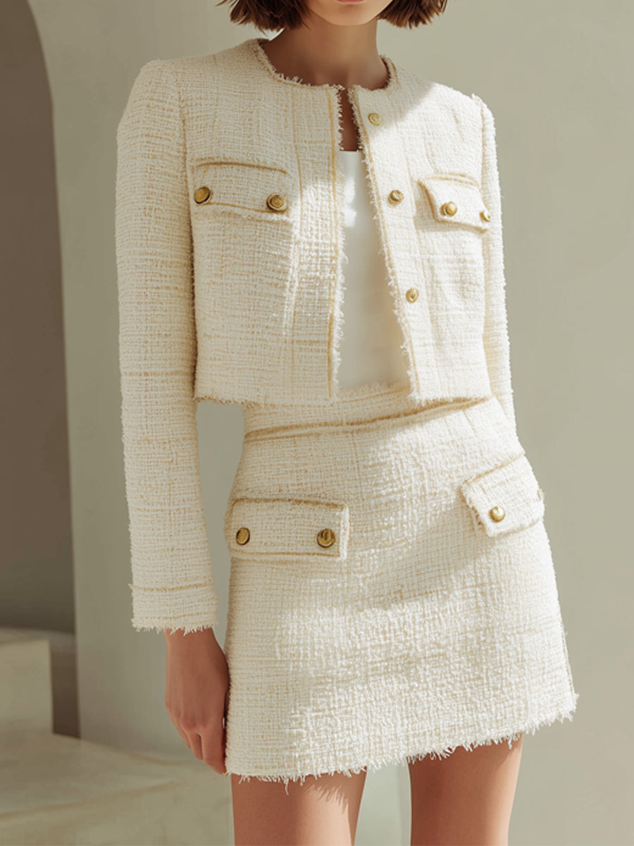 Ivory Tweed Cropped Jacket And Mini Skirt Set